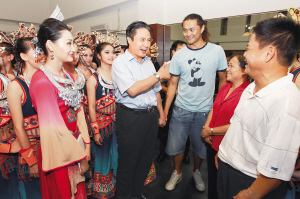 | 7月11日晚,省委书记、省人大常委会主任罗保铭看望了原创舞蹈诗《黎族故事》主创及演职人员。 本报记者 王凯 摄 |