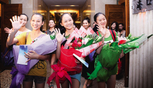 | 7月12日,海口美兰国际机场,《黎族故事》剧组演员挥手致意。当天,该剧组奔赴韩国丽水参加世博会,向外国观众展示海南魅力。 张茂 摄