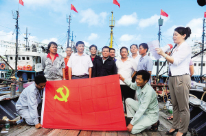 捕捞船队中共有13名共产党员,符合成立支部的条件。7月12日,船队出发前举行了临时党支部成立仪式。 本报记者 苏建强 摄