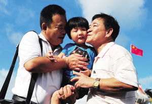 “来来来,亲一下爷爷……”7月12日早上,三亚水产码头,海榆渔民专业合作社的梁亚排依依不舍地告别前来送行的小孙女。