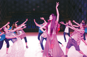 今天是江苏活动周的最后一天,因此上午10分钟的彩排是赶在江苏省代表团舞蹈演员彩排的间隙进行的。虽然时间很紧,但《黎族故事》的演员们依然有条不紊地向在场的媒体展示了自己良好的舞蹈素质。今天彩排的剧目是《黎族故事》里面的一场,主要是展现黎家姑娘在吹奏鼻萧时的动人场景。在女主演王琳的领舞下,10多位美丽少女分成两队,在不大的舞台上舞姿翩翩地进行精彩演绎。
