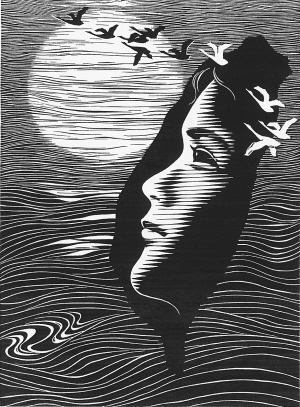 热情好客的张夫人,早已给我们沏好了香喷喷的白沙绿茶。但像以往一样,到地茂家,先得看他的版画。走进他的版画创作室,墙上悬挂着的一幅幅版画精品,浓浓的泥土芬芳扑面而来。尤其是地茂那幅成名作———《盼》,像一个巨大的磁场,紧紧地吸引着我,久久不能离开。在这幅画作里,艺术家以全新的创作理念,独特的艺术构思,浪漫的表现手法,娴熟细腻的技巧,把一位翘首遥望的少女形象定格在画面的黄金分割线上,以玉叶般的台湾岛地图作为铺垫,千姿百态的回归大雁作为引线。恰到好处地与象征祖国大陆的一轮明月遥相呼应。画面的四周,再用翻滚不息的大海碧波作为点缀,使得整幅作品协调和谐,简洁精练,厚重大气。你站在这幅画的跟前,无需解说和点评,你会领略到《盼》的深刻内涵、并自然而然地产生了“举头望明月,低头思故乡”和“海上生明月,天涯共此时”的共鸣和震撼。