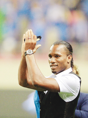 | 德罗巴在上海申花主场虹口体育场问候球迷。 新华社发 |