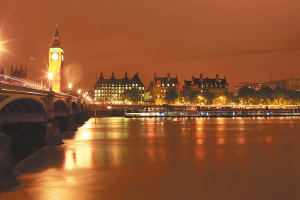 | 夜色中,伦敦泰晤士河畔的大本钟等古建筑。 海南日报记者 张杰 摄 |
