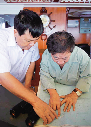 | ←我省捕捞船队抵达永暑礁海域前,随船指挥人员查找锚点。 |