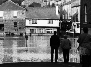 | ↓ 在英格兰北部的约克,人们望着超出正常水位的乌斯河。
