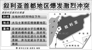 新华社大马士革7月15日电 叙利亚首都大马士革郊区塔德蒙地区15日下午爆发政府军与反对派武装之间的激烈交火,目前尚无人员死亡报告。 据叙利亚通讯社报道,武装分子在塔德蒙地区引爆了事先安置的爆炸装置,爆炸传出多声巨响,上空冒起滚滚黑烟,并传出激烈交火声,政府军随后对该地区进行大规模清剿,并与武装分子发生激战。 现场目击者称,大量民众从该地区撤离,进入附近的巴勒斯坦难民营暂时躲避冲突。