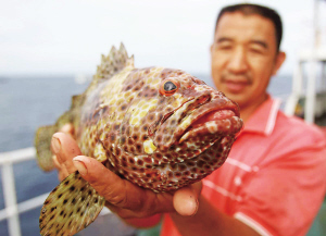 | 七月十六日,我省赴南沙的三十艘渔船船队在南沙中部渔场作业,船员钓到的这条石斑鱼重达三斤。 本报特派记者 李英挺 摄 |