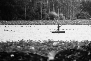 村民摇着小船在荷塘里采莲。
