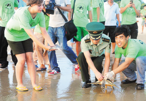 | 新村中学同学与911志愿者、边防派出所民警一起放流海龟与玳瑁。 (本报记者 苏建强 摄) |