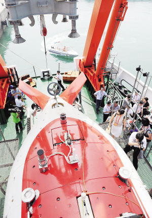 | ↑7月16日,参观者在“向阳红09”母船上观看“蛟龙”号深潜器。 |