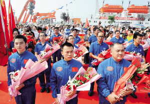 | →7月16日,三名深潜员在欢迎仪式上。 (本版照片:新华社发) |