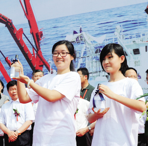 | ↑7月16日,两名中学生在展示海试团队赠送的7000米深度海底水样。 |