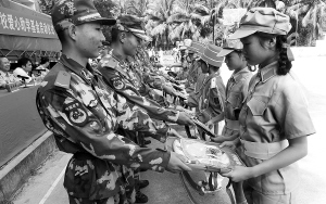 7月18日,边防后勤基地汽车训练大队来到五指山市毛阳镇中心学校,给山区的孩子们送来书籍、文体用品、并捐赠了助学基金、慰问了贫困学生家庭。 本报记者 苏建强 摄
