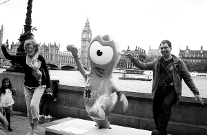 十九日,伦敦奥运会吉祥物文洛克雕像现身伦敦街头,可爱的形象吸引了很多游人驻足合影。 新华社发