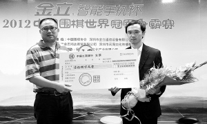 19日,2012中国围棋世界冠军争霸赛颁奖仪式在京举行。谢赫九段(右)获得冠军,古力九段获得亚军,江维杰九段和孔杰九段获得并列季军。 新华社发