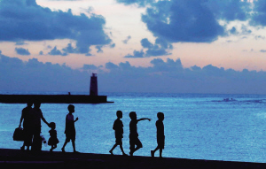 | 7月19日,晚霞下,永兴岛的居民们在悠闲散步。 |