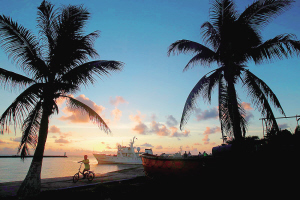 | 7月19日,落日霞光映照下的西沙永兴岛港口。 |