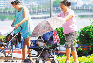 7月19日,刚刚入伏的鹿城三亚热浪灼人,给市民出行带来了极大不便。图为带着婴儿上街的家长用太阳伞为孩子遮挡烈日。 特约记者孙清 摄影报道