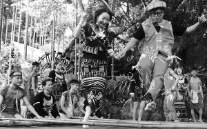 | 7月22日,来自韩国的金诗妍等多名影视明星与阿里郎组合穿上黎族盛装,在保亭槟榔谷景区跳起了欢快的黎家竹竿舞。