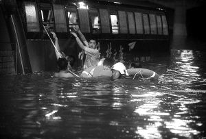 “汪洋”中的广渠门桥,五辆车搁浅。水中,一名警察对人群里喊道:“谁来帮忙拉一把”,几十人冲上去协力拉绳子,努力将车辆向积水浅的地方拖。在积水深的路段,交警用自己的身体做标杆,引导车辆通过;在北太平桥下,几个井盖被水压冲开,每个井盖都有一名环卫工人把守,拿身体作警告标志。