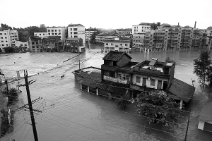 ← 7月22日拍摄的内江市东兴区高桥镇被洪水淹没的街区。 7月21日晚至22日晨,四川省内江市遭遇暴雨袭击,造成东兴区部分民房被淹,大量群众被困。
