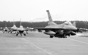 | 美国驻日本三泽空军基地一架美军F-16型战机,22日在北海道根室市附近的太平洋海域坠落。图为资料照片:美军F-16型战机在基地等待起飞。 新华社/法新 |