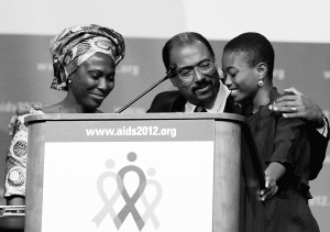 | 大会开幕式上,联合国副秘书长兼艾滋病规划署执行主任米歇尔·西迪贝(中)与一对来自尼日利亚的母女(其中母亲是艾滋病病毒携带者)相拥在一起。 新华社发 |