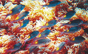 记者有幸几次到过西沙,随后又跟随海南海事局海事巡逻船到达南沙,沿途看见蓝色的海水中游弋的鱼儿,非常美丽。红的、黄的、蓝的、绿的、黑的、彩色的……各种色彩应有尽有,它们的颜色,比陆地上的花儿、鸟儿更加漂亮,也许是生活在热带,那些鱼、虾、蟹的颜色,特别五彩斑斓,非常鲜艳,有一种蓝魔鱼,身上的蓝色,是孔雀蓝也没法与之相比的颜色,是雨后最湛蓝的天空也没法与之相比的颜色。