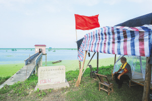 7月23日15时,洞庭湖城陵矶站水位33.06米,超警戒水位0.56米,高于有水文记录的历年同期均值2.89米,这是近年来洞庭湖罕见的高水位。洞庭岸边、长江之南的湖南省岳阳市共组织1.2万人上长江干堤与洞庭湖堤岸。新华社记者 白禹 摄