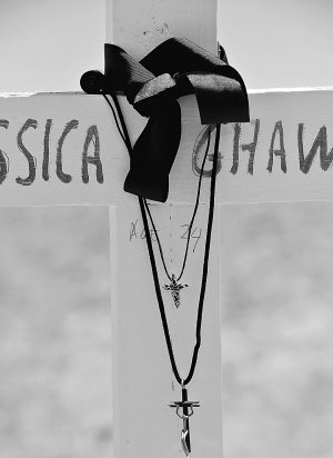 | 挂在悼念枪击案遇难者的十字架上的项链。 新华社发 |