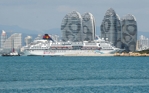 | 灯火辉煌的宝瓶星号邮轮静静地停靠在三亚凤凰岛国际邮轮港码头。 |