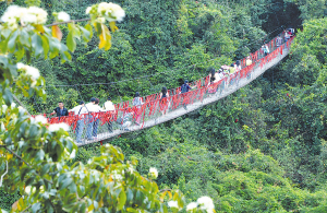 | 三亚亚龙湾热带天堂森林公园游客在穿越吊桥观赏森林美景。 |