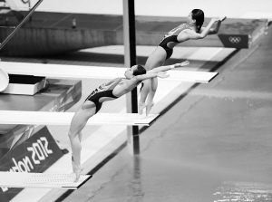 7月25日,中国跳水队在伦敦奥林匹克水上运动中心游泳跳水馆积极备战。图为吴敏霞(左)、何姿在进行双人三米板训练。 新华社发