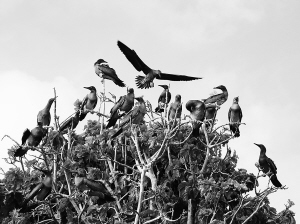 | 集群的红脚鲣鸟幼鸟。 曹垒 李长寿 摄 |
