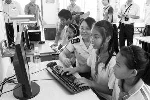 近日,海口市国税局与人民网海南视窗共同举办“捐电脑,送爱心”活动,将10台电脑捐赠给白沙县鹦哥岭元门中心学校,为支援山区基础教育献上一份绵薄之力。图为税务干部指导孩子们使用新安装的电脑。(夏昊 摄)
