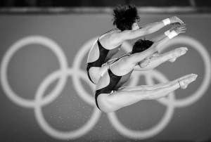 7月31日,在伦敦奥运会女子双人10米跳台跳水决赛中,中国组合陈若琳/汪皓以368.40分的总成绩夺冠。图为陈若琳/汪皓(上)在比赛中。 新华社发