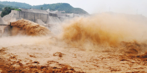 黄河小浪底水库控泄的壮观景象。 黄河干流1号、2号洪峰日前抵达小浪底库区,小浪底水利枢纽打开3个闸门加大泄洪量,加强对洪峰的调节,裹挟着泥沙的水流从小浪底出水口排沙洞喷涌而出,场面十分壮观。 新华社发