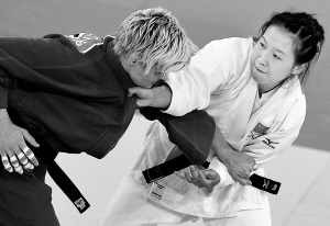 8月1日,在柔道女子63公斤级决赛中,徐丽丽(右)不敌佐尼尔,获得亚军。