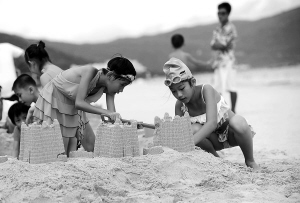 | 暑期,一些孩子在三亚亚龙湾红树林度假酒店沙滩上堆沙雕。家庭亲子游是夏季三亚各大酒店针对反季节游客推出的优惠套餐。