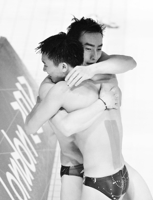 | ↑8月2日,中国选手秦凯(右)/罗玉通在获得伦敦奥运会男子双人3米板冠军后拥抱庆祝。 新华社发 |
