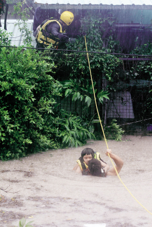 | 8月2日,台湾新北市消防队员解救被水围困的居民。 |