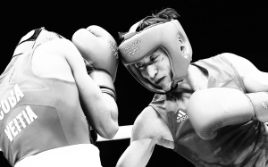 8月4日,在拳击男子49公斤级八分之一决赛中,邹市明(右)以14:11击败古巴小将维蒂亚,晋级八强。 新华社发