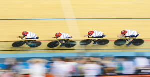 | 北京时间8月4日,在伦敦奥运会自行车男子团体追逐赛中,英国队夺得冠军,并打破世界纪录。图为英国队队员在比赛中。 新华社发