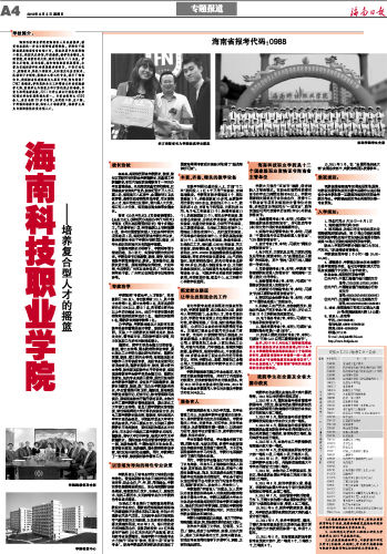 海南科技职业学院经海南省人民政府批准,教育部备案的一所全日制普通高等院校。学院位于国际旅游岛海南省省会海口市。校址是原中央美院海口校区。校园风光秀丽,环境幽雅,教学设备精良,交通便捷,距离新省委大院、琼州大桥约2.5公里。学院立足海南,面向全国,结合海南经济发展需要,本着为区域经济和社会发展服务的宗旨,开设石油化工、航海技术、轮机工程技术、太阳能光电应用技术、机械设计与制造、数控加工等工科专业,填补了海南空白。校园标志性建筑物为九层图书馆,馆内购置了CNKI数据库。学院坚持走以工科带动文科的实践教学之路,重视学生外语能力和计算机能力的培养,目前已取得显著成效,2011年学生参加计算机等级考试通过率全省高校排名第一。目前在校师生6500余人,来自全国20多个省市,达到进口顺、出口畅、中间强的培养目标,保证人才培养质量,培养学生成为与国际接轨的复合型人才。