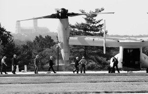 美防长帕内塔会见森本敏 日本防卫大臣森本敏8月3日造访五角大楼,与美国国防部长利昂·帕内塔会谈,试乘了MV-22型“鱼鹰”倾转旋翼机。美国国防部长利昂·帕内塔说,要让日本防长亲自体验“鱼鹰”“让人印象深刻的能力”。图为森本敏(右三)准备登上停在五角大楼的一架“鱼鹰”倾转旋翼机。 新华社/法新