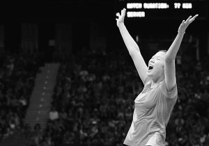 北京时间8月4日晚,在伦敦奥运会羽毛球女单决赛中,中国队90后小将李雪芮以2:1战胜新科世锦赛冠军王仪涵,首次参加奥运会便夺冠,也为中国队实现了该项目的奥运四连冠。这也是中国代表团在本次奥运会上的第21金。图为李雪芮高举双臂庆祝胜利。 小新发