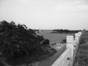 绕过桥墩,我们来到江边,彭四平指着一块残缺的水泥地板告诉记者,这里原来是游泳场的近水平台,附近一棵约300年树龄的古树旁就是建观景台的地方。昔日盛况不再,唯有川流不息的江水依然冲刷着江堤,新埠大桥和防护堤横空凌驾之上,岸堤对面是金水门银河海鲜酒楼,一派灯红酒绿的喧嚣景象。四周,林立的楼房,高高低低。