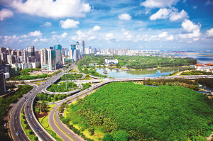| 在科学发展观的指引下,海南找到了一条以人为本、环境友好、集约高效、开放包容、协调可持续发展的绿色崛起之路。图为省会海口一瞥。 本报记者 李幸璜 摄 |