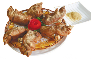 卤好味的猪蹄被取出晾干。接着,便是高温油炸。被劈成扁平状的猪蹄皮面朝下,炸至金黄色时即可捞起装盘,再撒上些事先准备好的调料,加适当的摆盘设计,一盘味香色美的椒盐猪蹄便可上桌了,餐厅内顿时香气四溢。